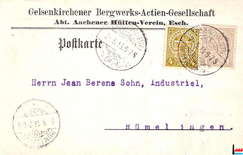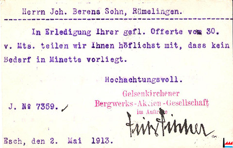 Postkarte der GBAG - Abteilung Aachener Hütten-Verein, Esch (Adolf-Emil-Hütte und Aachener Hütte) an Jean Berens Sohn, Rümelingen - Unterschrift: Fritz Fischer - 2-5-1913 (Collection: Marcel Schlim)