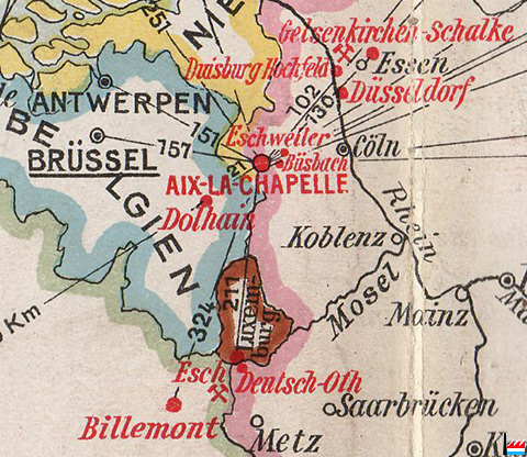 Es handelt sich um die Société Minière des Terres Rouges, welche vom französischen Sequester die in Lothringen und Frankreich gelegenen Anlagen Gelsenkirchens (speziell die Erzgruben und das Hochofenwerk von Deutsch-Oth) käuflich übernommen hat (für 38,5 Millionen). Die in Esch sich befindliche Société Métallurgique des Terres Rouges erwarb bekanntlich alle auf dem linken Rheinufer sich befindlichen Anlagen Gelsenkirchens. speziell in Esch/Alzette und Aachen, sie steht indes mit der Société minière in enger Verbindung. ... (OMZ: 8.6.1921) |