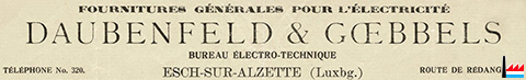 | 5.5.1931 | Industrielles: Wie wir erfahren, ist die bekannte Elektro-Großhandlung E. Goebbels, Luxemburg, Goethestraße, 14, in eine Aktiengesellschaft unter der Firma „Union Electro-Industrielle. S. A. (anc. Etablissements E. Goebbels)" umgewandelt worden. Das Aktienkapital wird sich auf eine Million Franken stellen und größtenteils von der Gesellschaft „Minusines", Luxemburg. Petrußring 57, übernommen werden. Das Unternehmen wird in derselben Weise, wie bisher, weitergeführt. Der Direktor der Gesellschaft „Minusines", Herr Josef van Werveke, wird gleichzeitig Delegierter-Verwaltungsrat der neuen Gesellschaft sein. Auch Herr E. Goebbels der bisherige Inhaber der (Elektro-Großhandlung E. Goebbels, wird dem Verwaltungsrat der neuen Gesellschaft angehören. (LW: 5.5.1931) |