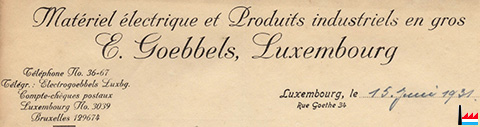| <=1931 | Matériel électrique et Produits en gros E. Goebbels 34 rue Goethe, Luxembourg |