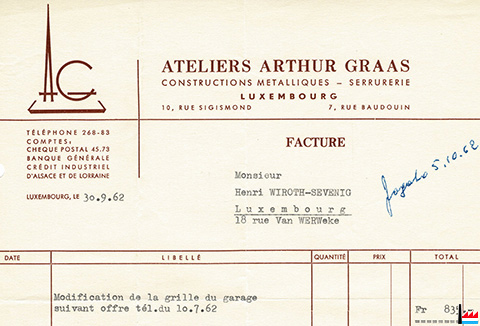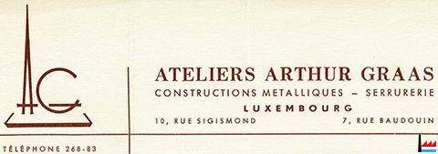 | <=1962 | ![]() Ateliers Arthur Graas - Constructions métalliques - Serrurerie, Luxembourg, 10 rue Sigismond - (Domicile: 7 rue Baudouin), tél: 26883 - facture de 1962 (Collection industrie.lu) |