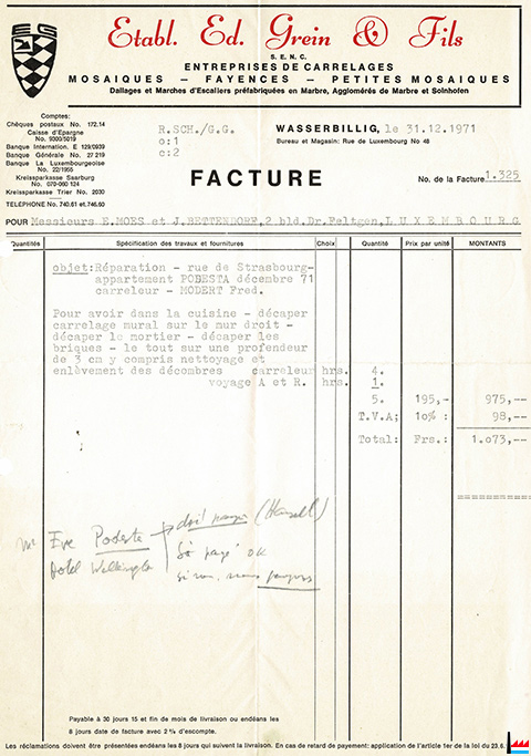 ![]() Etablissement Ed. Grein & fils, Wasserbillig, 48 rue de Luxembouirg, entreprise de carrelages, mosaïques, fayences, petites mosaïques, tél: 74061 - facture: 31.12.1971 (Collection: industrie.lu) |