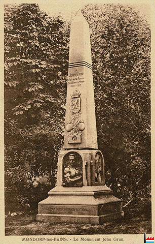 | Un monument John Grun à Mondorf-les-Bains Il y a quelques temps, les journaux avaient annoncé que le comité du monument John Grun s’était entendu avec le Conseil communal de 'Mondorf au sujet de l'emplacement de la pyramide commémorative. Les plans et projets du monument sont déposés à la mairie de Mondorf. Mais l’emplacement choisi - à proximité de l’ancienne poste - n’a pas obtenu l’agrégation de M. le Directeur général des Travaux publics, de sorte que le concours est de nouveau ouvert. (LIL: 23.4.1914 |