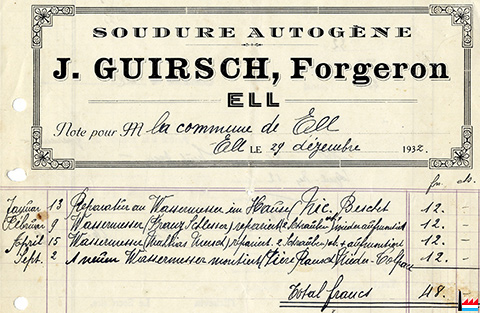 | 1900 | ![]() Guirsch N., Schmied in Ell - Rechnung - 1900 (digitaalt Archiv Romain Gaspar) |