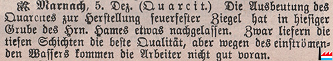 | 1904 | Quarzit-Grube Hames, Marnach Die Ausbeutung des Quarzites zur Herstellung feuerfester Ziegel hat etwas nachgelassen. Zwar liefern die tiefen Schichten die beste Qualität, aber wegen des einströmenden Wassers kommen die Arbeiter nicht gut voran. (Luxemburger Volkszeitung: 6.12.1904 Seite 2) |