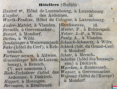 (Source: Almanach du Commerce du Grand-Duché de Luxembourg par N.C., 1re année, 1857, Luxembourg, Heintzé Frères, Libraires-Éditeurs, page 27; Collection: famille Aschman-Bodson)