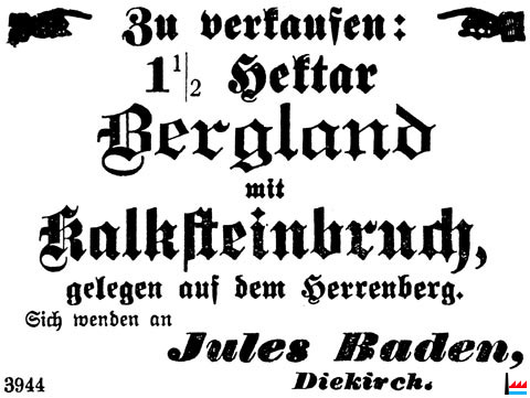 | 1921 | ![]() 1,5 Hektar Bergland mit Kalksteinbruch auf dem Herrenberg zu verkaufen - Jules Baden, Diekirch - Annonce de 1921 (Scan: Serge Kugener) |
