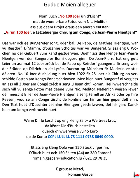 | 1922 - 1947 | ![]() Dr Jean-Pierre Hientgen, e Lëtzebuerger Chirug am Congo (Digitaalt Archiv Romain Gaspar, Sammlung Hientgen, Nice) |