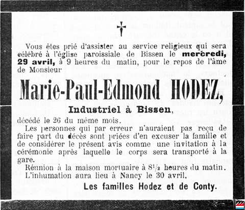 | 26.4.1908 | ![]() Décès de Marie-Paul-Edmond Hodez, industriel à Bissen (LIL: 28.4.1908) Familles Hodez et de Conty |