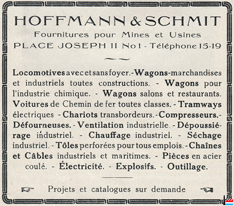 | 1922 | Hoffmann & Schmit - Fournitures pour mines et usines 1 place Joseph II, Luxembourg |