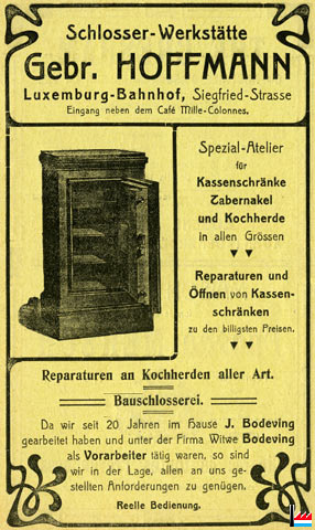 | <=1907 | Ateliers Hoffmann frères Gebrüder Hoffmann, Vorarbeiter unter der Firma Witwe Bodeving Siegfried-Straße, Luxemburg-Bahnhof, Eingang neben Café Mille Colonnes |