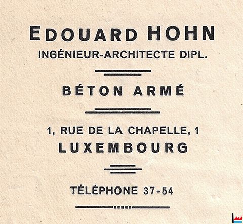 Edouard HOHN Ingénieur - Architecte dipl. 1, Rue de la Chapelle Téléphone 37-54 - Luxembourg Projets - Devis - Calculs - Surveillance - Décomptes - Expertises - Arbitrages de toutes constructions civiles et industrielles. NB. Bureau d'Etudes pour béton armé. (LW : 9.8.1933) |