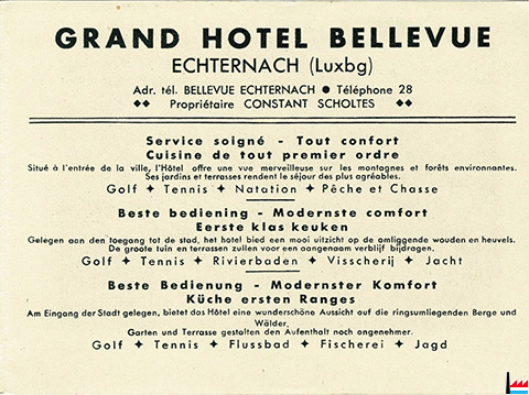 | <=1935 | Grand Hôtel Bellevue, Echternach, propriétaire Constant Scholtes - tél: 28 |