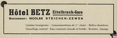 | <=1948/49 | Hôtel Betz, Ettelbruck, propr. Steichen-Zewen. 2 rue de la Gare, tél: 2305 |