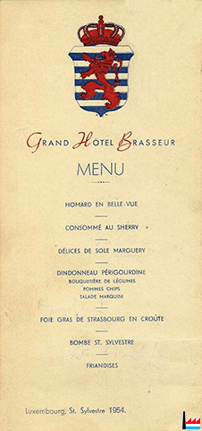 ![]() Grand Hôtel Brasseur - Menu de la St. Sylvestre 1954. (Collection Philippe Aschman) Homard en Belle-Vue - Consommé au Sherry - Délices de Sole Marguery - Dindonneau Périgourdine - Bouquetière de légumes - Pommes Chips - Salade Marquise - Foie gras de Strasbourg en croûte, Bombe St. Sylvestre - Friandises |
