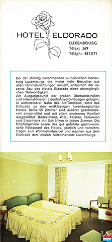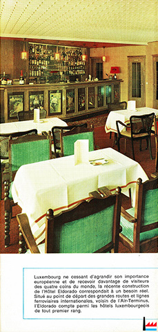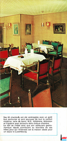 | 1966 - ? | Hôtel Eldorado, Luxembourg, 7 place de la Gare, tél: 481071 42 chambres François Reckinger |