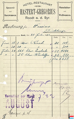 | 25.7.1922 | ![]() Hôtel - Restaurant Hastert - Gregorius, Roodt/Syre - facture du 25.7.1922 au Casino de Dudelange (Collection: industrie.lu) Spezerei und Kurzwaren, Manufakturwaren und Wollwaren |