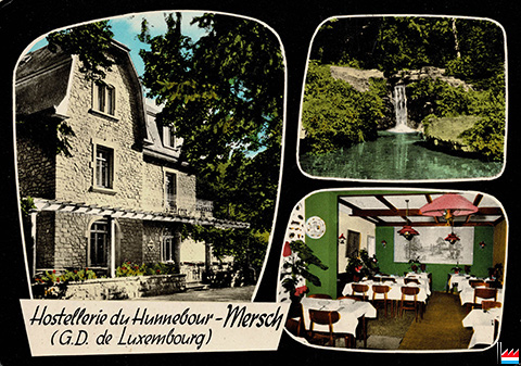 | 27.2.1965, 1968 | Ouverture Hostellerie Hunnebour Home Pierre Krier route de Mersch, Ansembourg Nouveau gérant: Michel Reuter (+ 1974 à l'âge de 53 ans) - Tosi (avant Hôtel Astoria, Mondorf) Cuisine soignée par le patron et son fils Josy Bières Mousel, Canada Dry, Rosport |