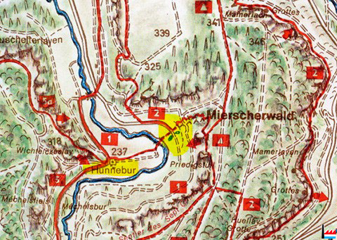 ![]() Hostellerie Hunnebur (à gauche Hunnebur 237) - Etang / sources du Hunnebur (à droite) - Carte de 1969 (Collection: Nico Lucas) Wichtelcheslay - Méchelsbur - Hunnebur - Priedigstull - Mamerleeën - Mamerlayen - Huellay |