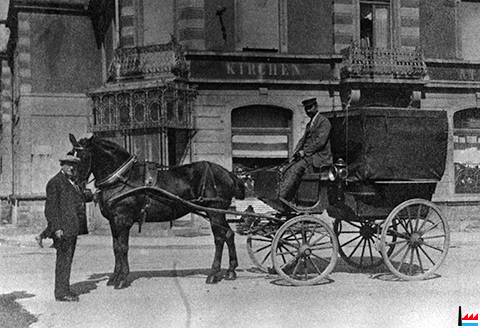 | <=1930 | ![]() Joseph Monseur, chef des essais à l'Usine de Rodange, devant l'Hôtel Kirchen à Pétange - sur le siège de la voiture Michel Brix, chef charretier - <=1930 (Archive MMRA) |