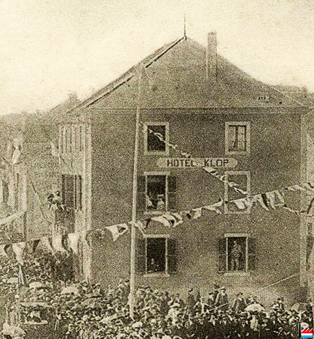 Hôtel Klop, Esch/Alzette - während den Stadttitelverleihungsfestlichkeiten - 19-20.8.1906 (Extrait de la carte postale: Vogt's Verlag, Esch - 113969; Collection: industrie.lu)