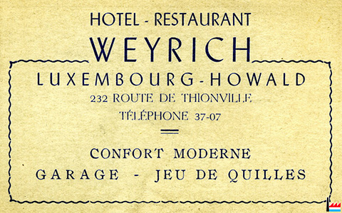 ![]() Hôtel - Restaurant Weyrich, Howald, 232 route de Thionville, tél: 3707 (Collection: Roland Schumacher) |