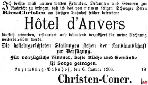 | <=1906, 1907 | Hôtel d'Anvers, Luxembourg-gare Prop.: J.P. Christen-Coner |