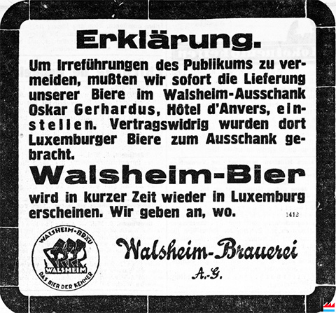 | 22.2.1936 | Neueröffnung der Rapid Brasserie, tél: 2736 Hôtel d'Anvers, Luxembourg-gare Ausschank der Biere Walsheim und Clausen Direction: G. Hypolite (OMZ: 22.2.1936) |