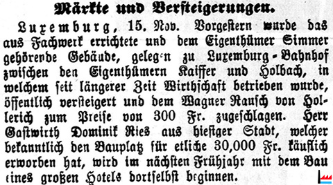 | 5. 1905 | Ersteigerung des Hôtel d'Anvers, durch Pies Nicolas, entrepreneur, Luxembourg-gare (LW: 31.5.1905) |