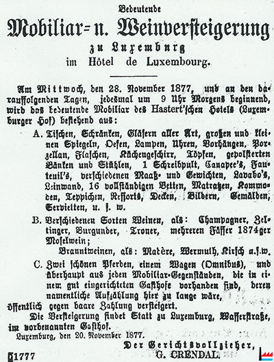 | 28.11.1877 | ![]() Bedeutende Mobiliar- und Weinversteigerung zu Luxemburg im Hôtel de Luxembourg. Am Mittwoch, den 28. November 1877, und an den darauffolgenden Tagen, jedesmal um 9 Uhr Morgens beginnend, wird das bedeutende Mobiliar des Hastert’schen Hotels (Luxemburger Hof) bestehend aus (…) öffentlich gegen baare Zahlung versteigert. Die Versteigerung findet statt zu Luxemburg, Wasserstraβe, im vorbenannten Gasthof. Luxemburg, den 20. November 1877. Der Gerichtsvollzieher, G CRENDAL. (LW: 26.11.1877) |