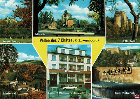 ![]() Vallée des 7 Châteaux (Luxembourg - Ansembourg - Mersch - Hollenfels - Marienthal - Septfontaines - Hôtel 7 Châteaux, Mersch, tél: 32255 (Carte postale: Editions photogr.: Ph. Heirand-Frisch, photographe, Mersch - N° 1004; Collection: industrie.lu) |