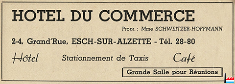| <=1948-49 | ![]() Hôtel du Commerce, Esch/Alzette, 2-4 Grand'rue, tél: 2880, propr. Mme Schweitzer - Hoffmann (Collection: industrie.lu) |