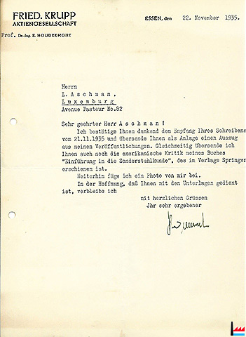 Fried. Krupp Aktiengesellschaft - Prof. Dr.-Ing. E. Houdremont - Essen, den 22. November 1935 - Archives Camille Aschman Jr - Collection famille Aschman-Bodson.