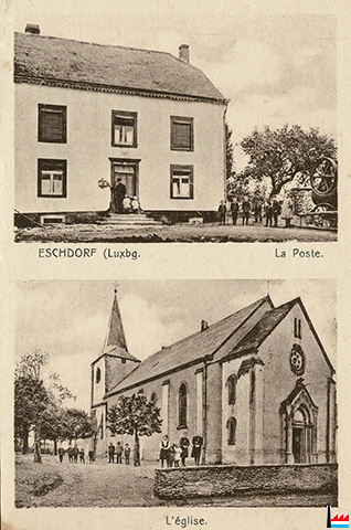 Eschdorf - La Poste - L'Eglise (Carte postale: No. 4 Maison de gros P. Houstraas, Luxembourg et Metz; Collection: industrie.lu)