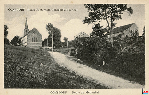 Consdorf, route du Müllerthal (Carte postale: No. 1 Maison de gros P. Houstraas, Luxembourg & Metz; Collection: industrie.lu)