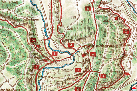 ![]() Mauschelterlayen - Wichtelcheslay - Méchelsbur - Hunnebur - Priedigstull - Mamerleeën - Mamerlayen - Huellay - Carte de 1961 (Collection: industrie.lu) |