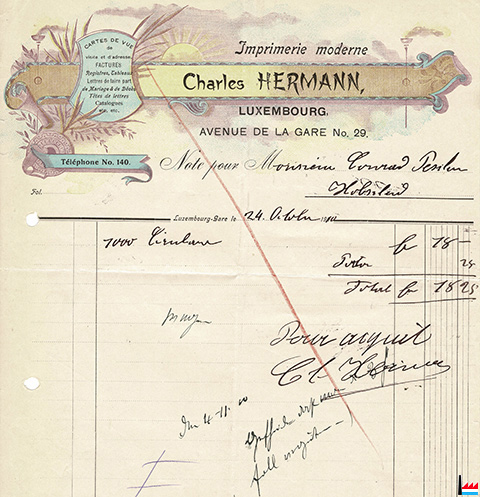 | <=1910 | ![]() Imprimerie moderne HERMANN Charles, Luxembourg, 29 avenue de la Gare - facture de 1910 (Collection: industrie.lu) |