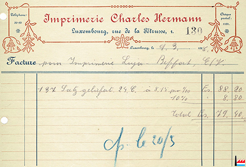 | <=1928 | ![]() Imprimerie Charles HERMANN, Luxembourg, 1 rue de la Pétrusse - facture du 9.3.1928 à Luja-Beffort, Luxembourg (Collection: industrie.lu) |
