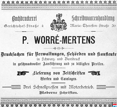 | 1891 | Fondation - Gründung: Imprimerie - Druckerei Pierre Worré-Mertens, Luxembourg Gerichtshofstraße 4 rue de l'Hôtel de Justice |