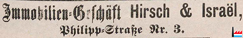 | 1907 | ![]() Immobilien-Geschäft Hirsch & Israël, Luxembourg, 3 Philipp-Straße ("Feuille d'annonces du Grand-Duché de Luxembourg" N° 98 vum 7. Dezember 1907 Säit 3 - scan: Fernand Toussaint) |