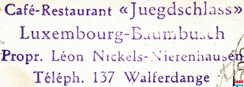 | <=8.1950 | ![]() Café-Restaurant Juegdschlass, Luxembourg - Baumbusch, tél: 137 (Collection: industrie.lu) Léon Nickels-Nierenhausen |