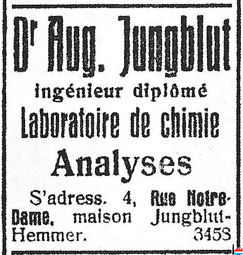 | <=1928 | Jungblut Auguste, ingénieur-chimiste. 4. rue Notre-Dame, Luxembourg |