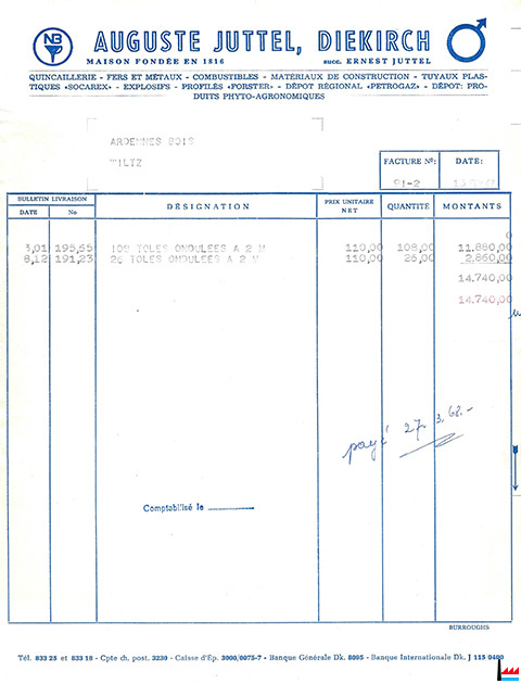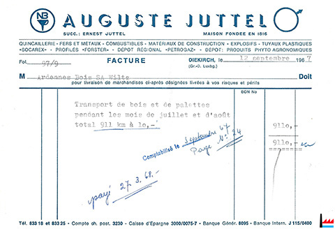 Facture du 12 septembre 1967 pour ARDENNES-BOIS, Wiltz (Collection Ph. Aschman)