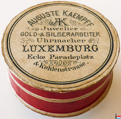 Auguste Kaempff - Juwelier, Gold & Silberarbeiter, Uhrmacher, Luxemburg, Ecke Paradeplatz & Kohlenstrasse. - Kartondose, Durchmesser 55 mm, Höhe 23 mm (Collection Philippe Aschman)