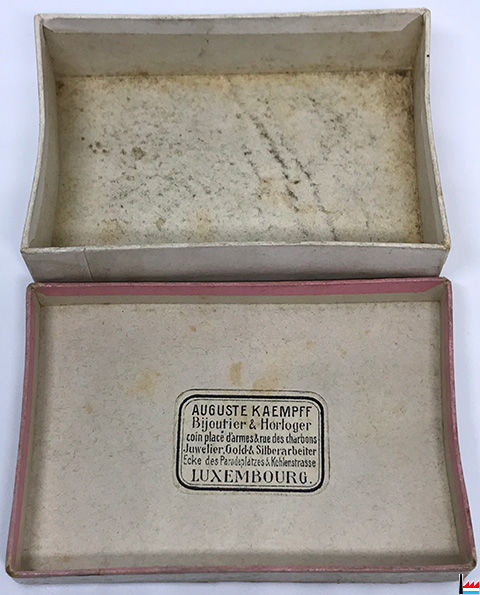 Auguste Kaempff Bijoutier & Horloger, coin Place d'Armes & rue des Charbons - Juwelier, Gold & Silberarbeiter, Uhrmacher, Luxemburg, Ecke Paradeplatz & Kohlenstrasse. - Kartonkästchen, 85 mm x 59 x 25 mm (Collection: industrie.lu)