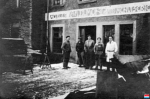 Jang Schmit 1925 als Léierjong virum Atelier am Äppelwee, zesumme mat Albert & Mathias Dumont an 2 Gesellen virum Schräineratelier, mat dem Schrëftzug A & M Dumont (Photo: Albert Dumont)