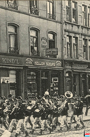![]() Münchner Kind'l (N° 35?) - Keller Soeurs (N° 35) - Ch. Stein (N° 37) - Hôtel de la Poste (N° 39), Luxembourg (Gare), avenue de la Gare - Rentrée de la troupe (Carte postale: Edition artistique P.C. Schoren, Luxembourg-Gare; Collection: industrie.lu) |