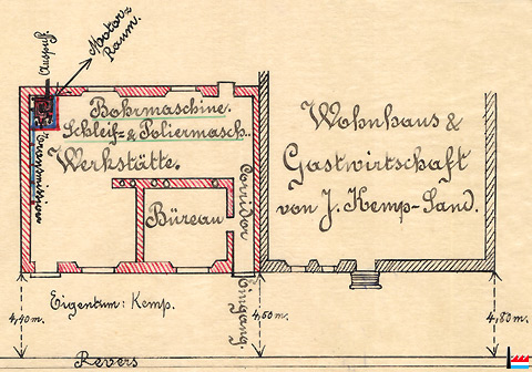 | 12.1913 | Jakob Kemp - Sand, Kayl Gesuch zwecks Erlangung der Ermächtigung zur Aufstellung eines Gas-Motors (Gardner-Motor N°4524, 8,5 PS) zum Antrieb einer Bohrmaschine, Schleifmaschine und Poliermaschine zwecks Herstellung von Carbid-Grubenlampen |