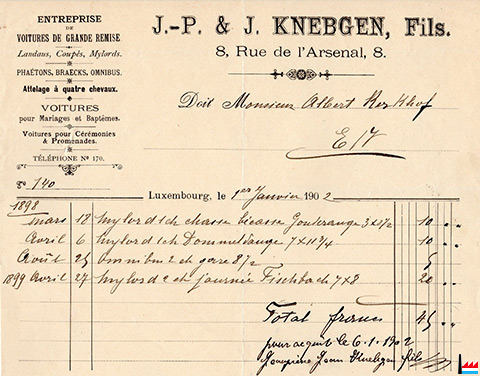 | 1902 | Entreprise de voitures de grande remise: Landau, Coupé, Mylord, Phaéton, Breack (Break), Omnibus, Attelage à 4 chevaux J.-P. & J. Knebgen, fils, 8 rue de l'Arsenal, Luxembourg - Facture à M. Albert Kerkhof - 1902 (Collection: industrie.lu) |