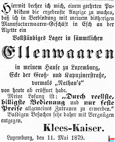 | 24.5.1879 | ![]() Klees-Kaiser, vormals Nathan's, Luxemburg, Ecke Groß- und Kapuzinerstraße (Der Arbeiter: 24.5.1879) |